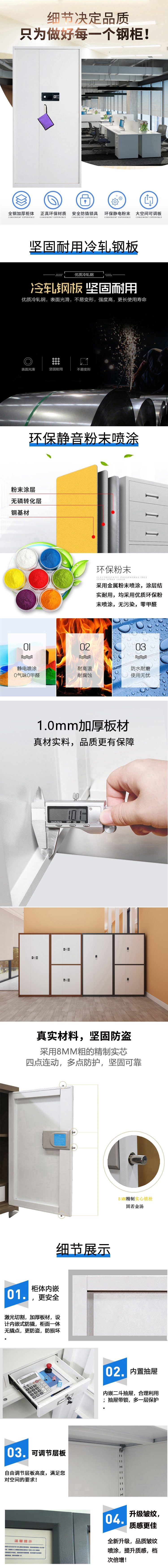规格:900W*400D*1850H 材质:一级冷轧钢板,厚度1.0mm/1.2mm 锁具:GA安全认证品牌液晶屏指纹大密码锁。