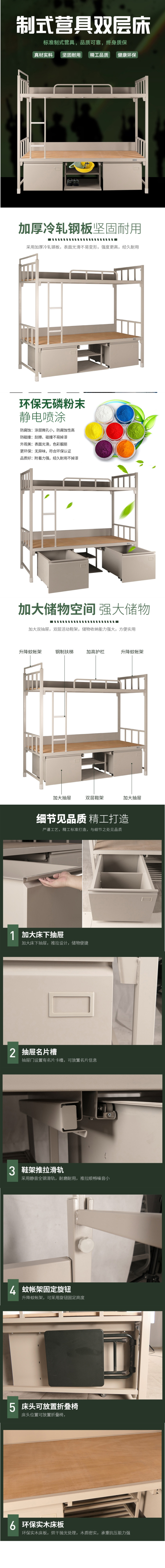 4、制式营具军用上下床(双层床)床下抽屉:采用0.8mm厚冷轧钢板(钣金工艺成型);