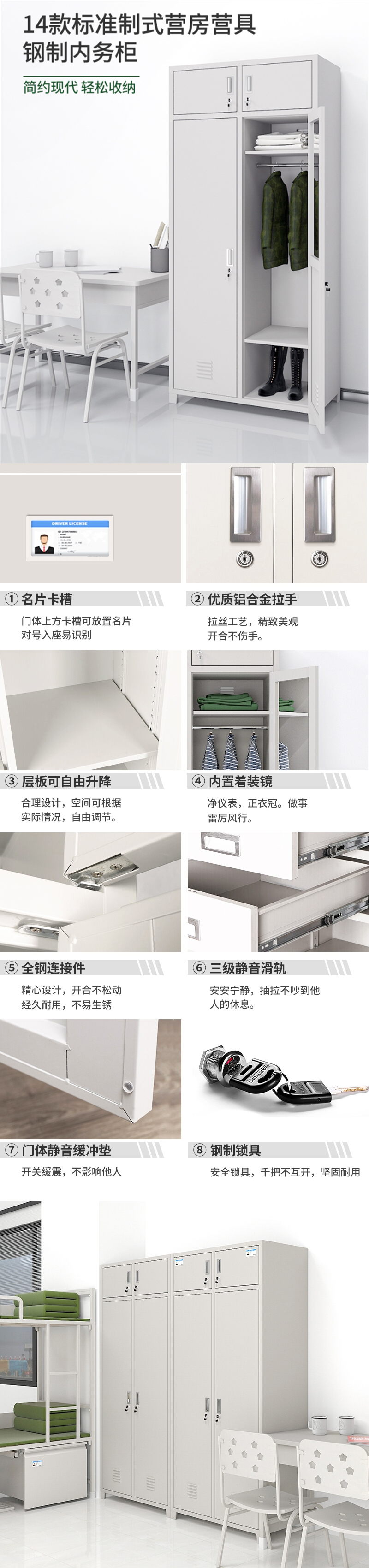 4、制式营具军官物品柜上门扇:采用0.8mm厚冷轧薄钢板(钣金工艺成型);