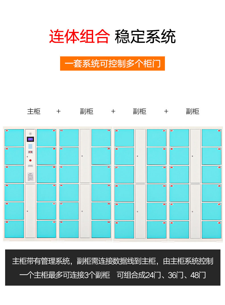 智能储物柜可选用12门/24门/36门/48门,可实现一主柜+多组副柜的操作方式。